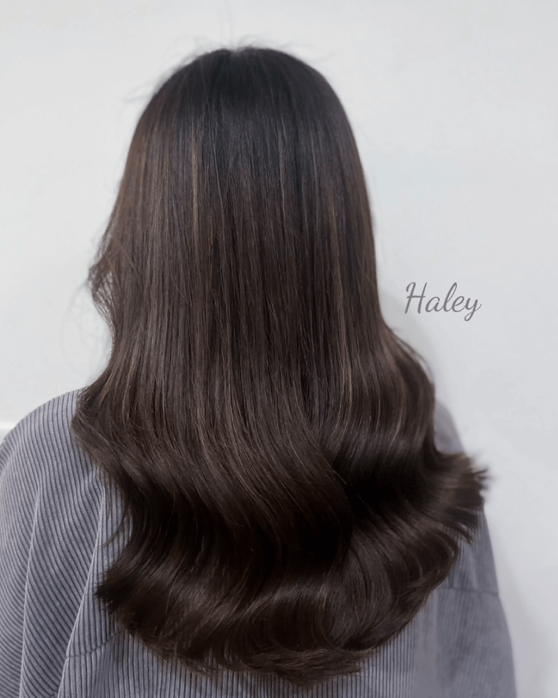 法式八字瀏海+雙餡漂染,黑茶色搭配凝夜紫,具有個人魅力的神秘風格。